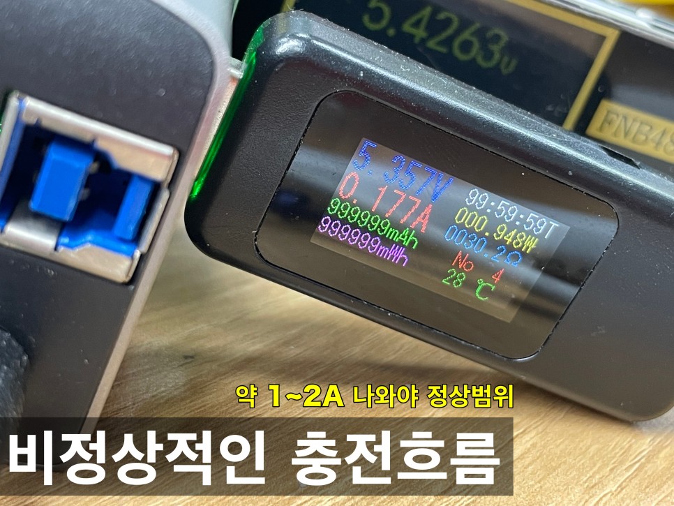 USB 전류 측정기를 사용하여 아이폰의 충전 전류를 확인합니다. 정상 수치는 0.9A 이상이지만, 이 경우에는 1/4 정도의 전류만 확인됩니다. 이것이 분리하지 않고 충전이 되는지 확인할 수 있는 유일한 방법이며, 분리 후 확인해야 합니다.