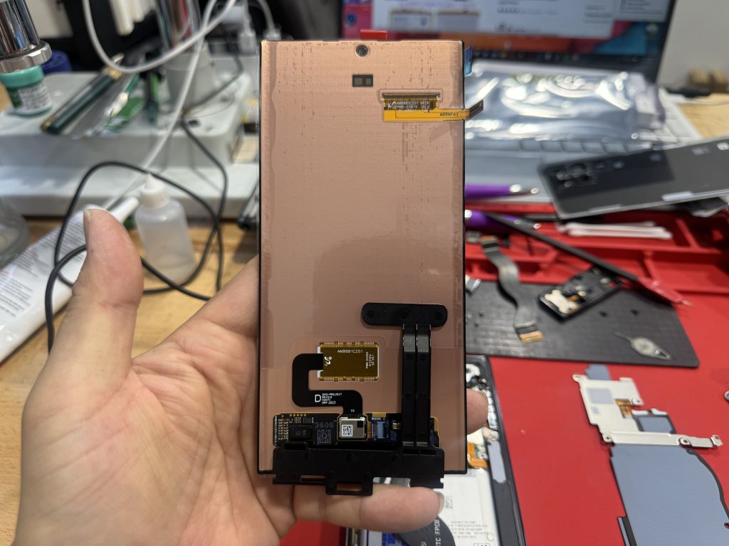 Repairing a Samsung screen takes a bit more time compared to repairing an iPhone screen. For an iPhone screen repair, you only need to remove the screen. However, for a Samsung screen repair, you need to remove the mainboard and back glass, as well as perform taping and clamping, which takes additional time.